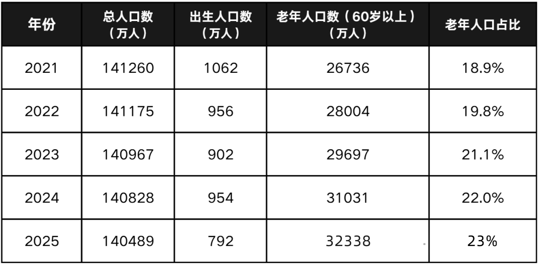 查询往年数据报告,整理出2021-2025年,我国的总人口数、出生人口数、老年人口数、老年人口占比,数据如下。可以看出,过去五年间,60岁及以上老年人口的规模与占比在加速攀升。