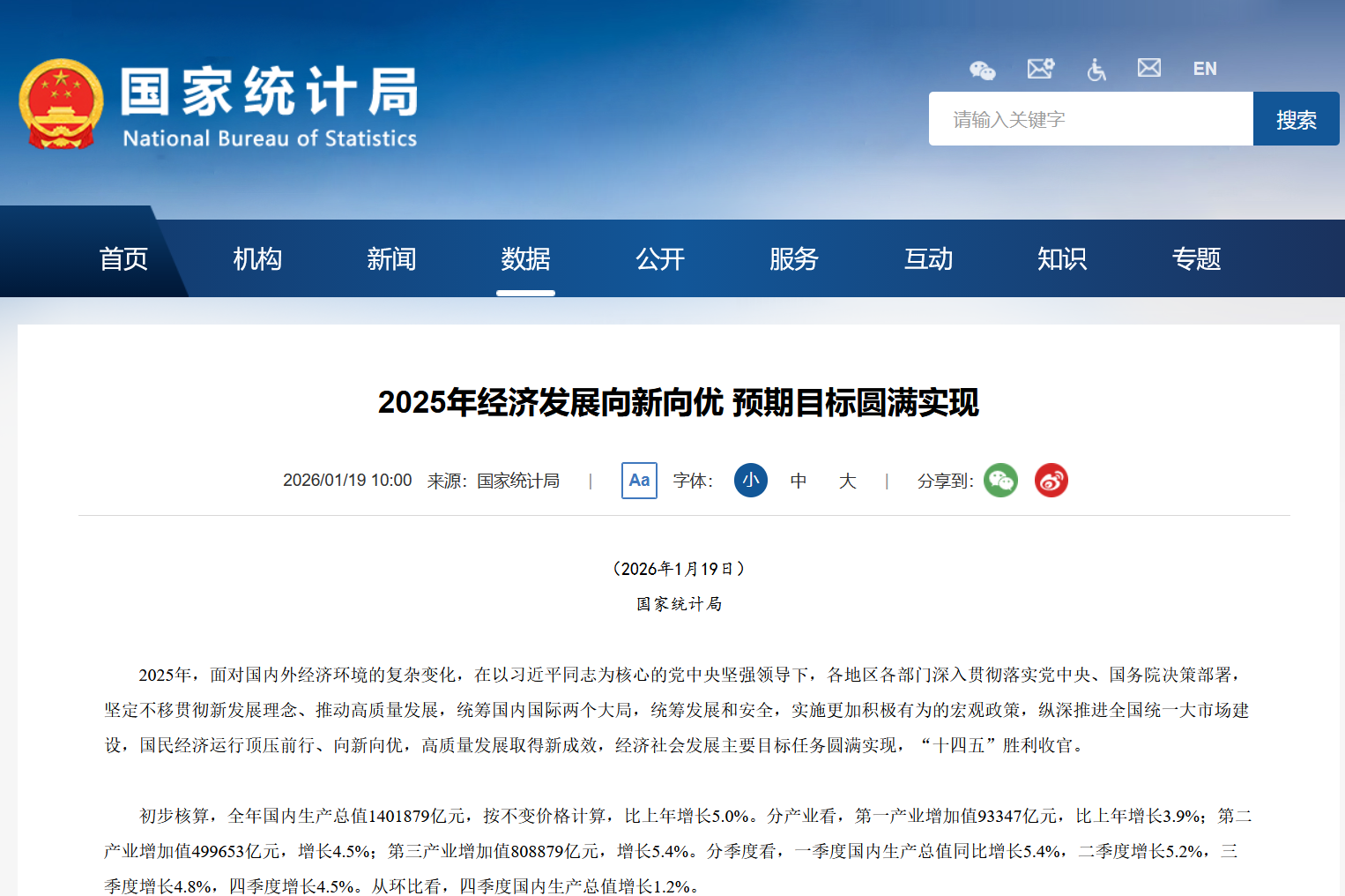 国家统计局今日发布《2025年经济发展向新向优 预期目标圆满实现》,公布了2025年国民经济数据。