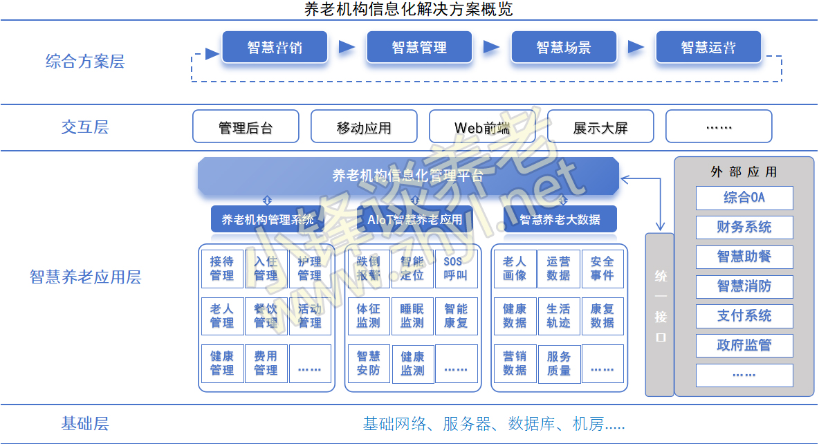 业务应用层:包含系统管理、接待入住管理、床位管理、护理管理、医养结合管理、行政管理、费用管理、资产管理、餐饮管理、数据分析十大核心模块;