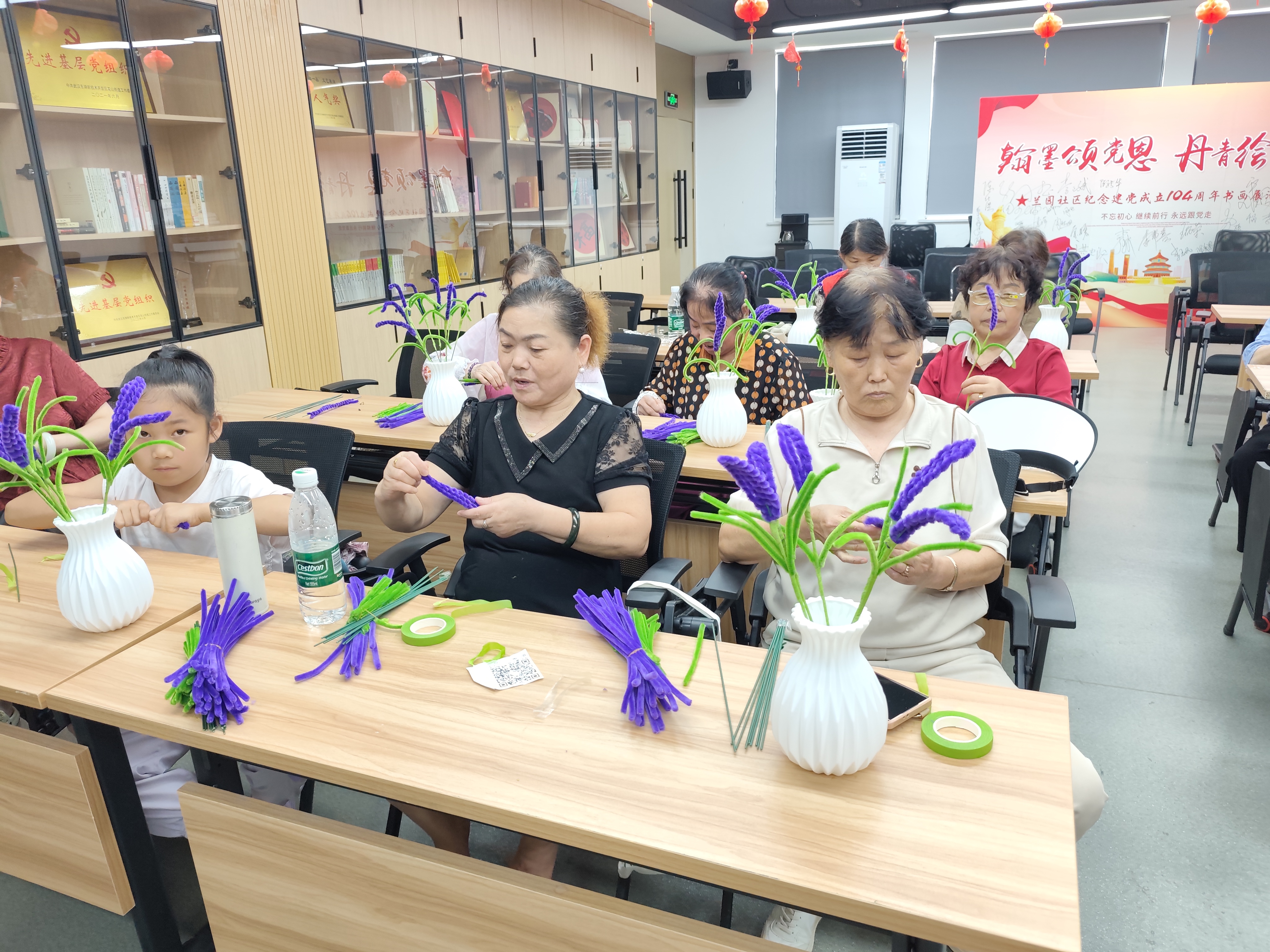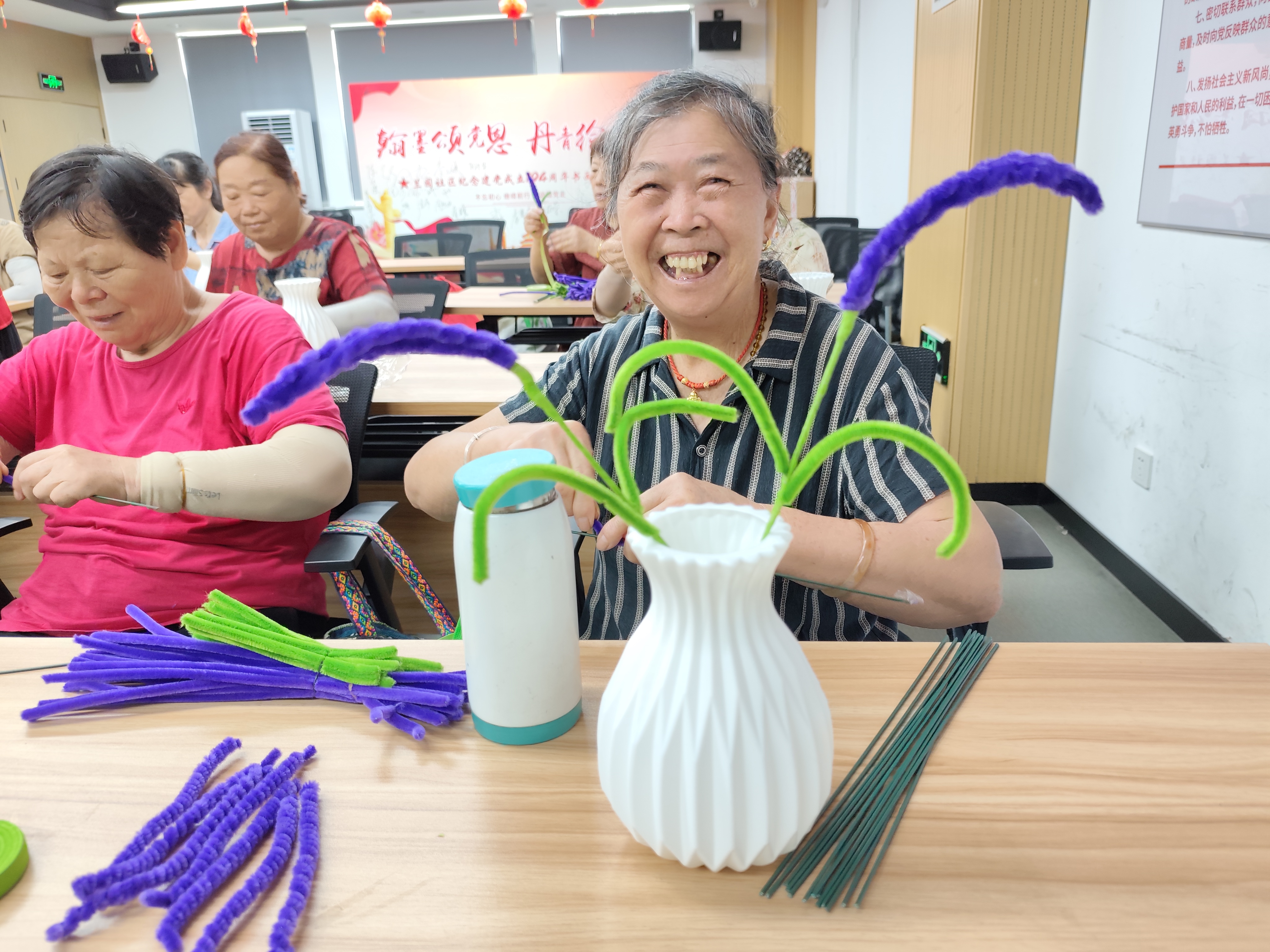 为丰富老年群体精神文化生活,提升动手能力与审美素养,2025年8月8日上午,花山街道兰园社区新时代文明实践站联合炎黄创新居家养老活动中心,共同举办“银发巧手·编织芬芳——DIY手工制作薰衣草永久花束”活动。30余名社区老人欢聚一堂,在花香与笑语中体验手工乐趣,为晚年生活添彩。