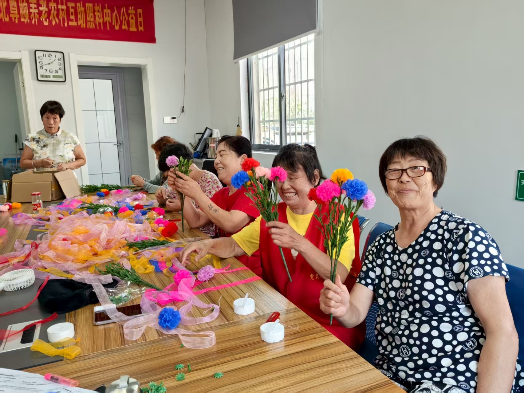 经过1个多小时的创作,原本普通的雪纱带被精心制作成一朵朵形态逼真的康乃馨。老人们手持自己的作品拍照留念,纷纷表示此次活动不仅学会了新技能,还感受到了手工创作的乐趣,希望中心今后多举办类似活动。