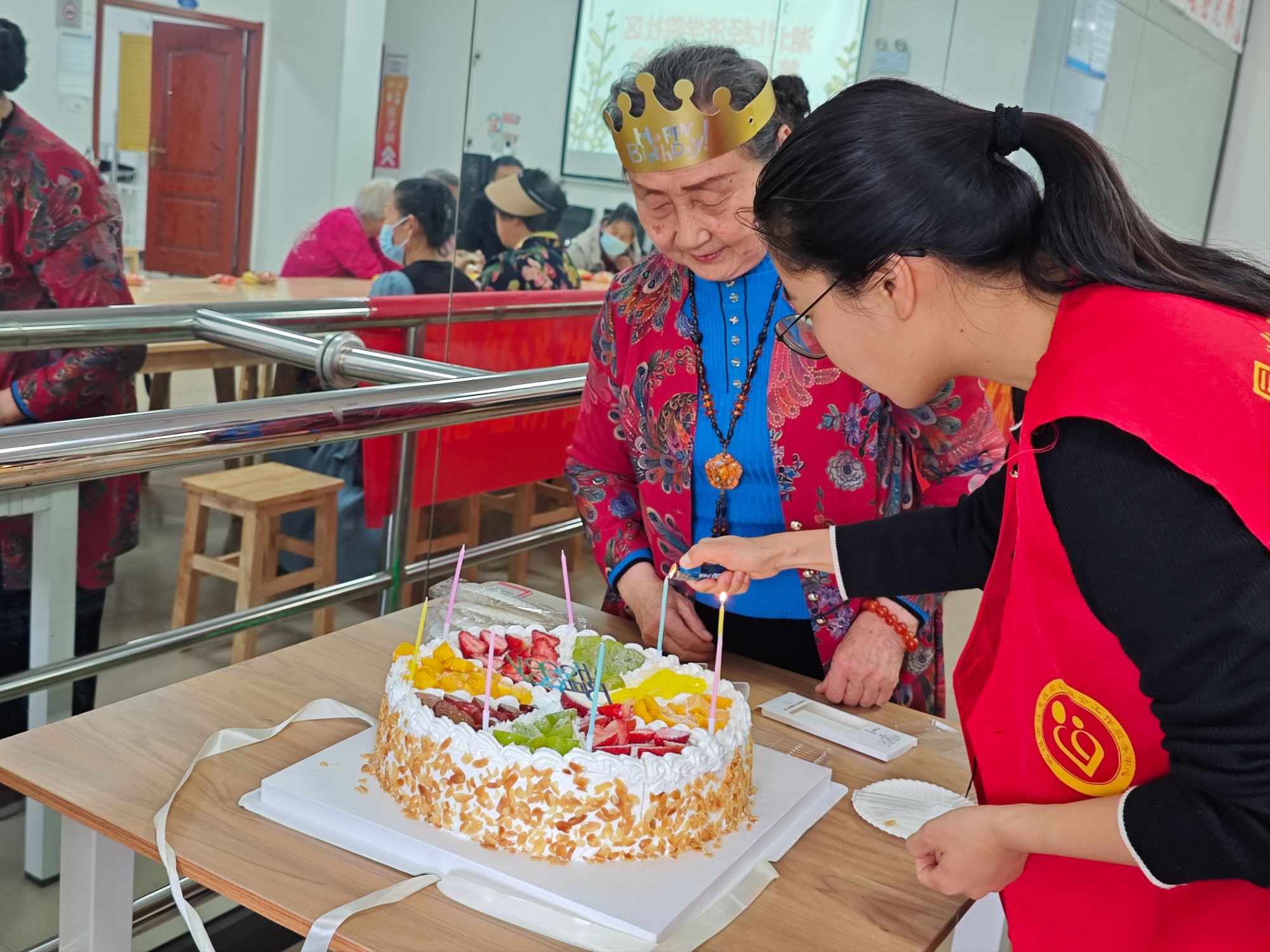随即工作人员推出定制蛋糕,并给老人们戴上了生日帽,还邀请了一位长者代表切蛋糕。志愿者们将水果和小点心一一分发下去,工作人员将一份份蛋糕切好送到老人手中。甜蜜蜜的蛋糕让老人们吃得甜到心里去了,笑着说道:“和这么多寿星一起过生日真有意思,大家好才是真的好!希望我们都好好的!”