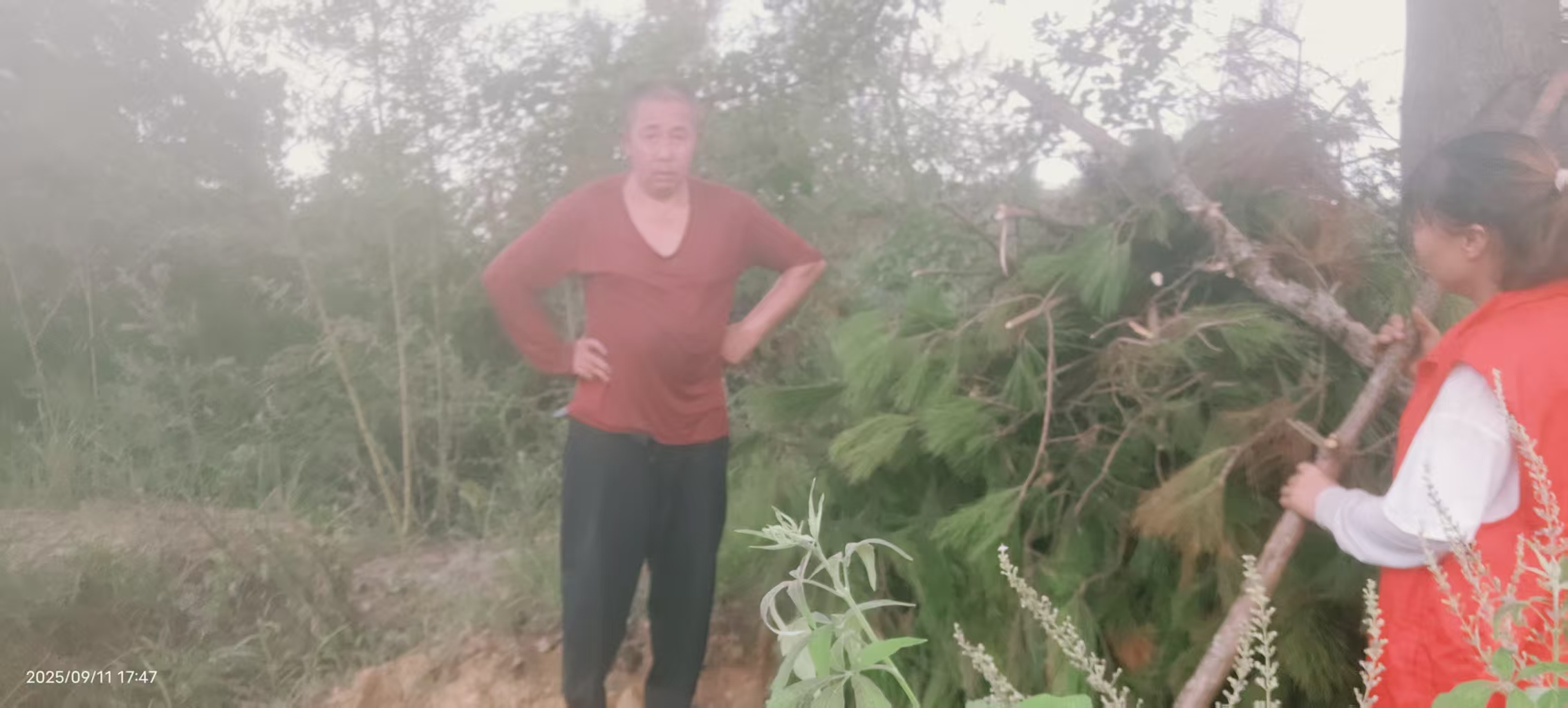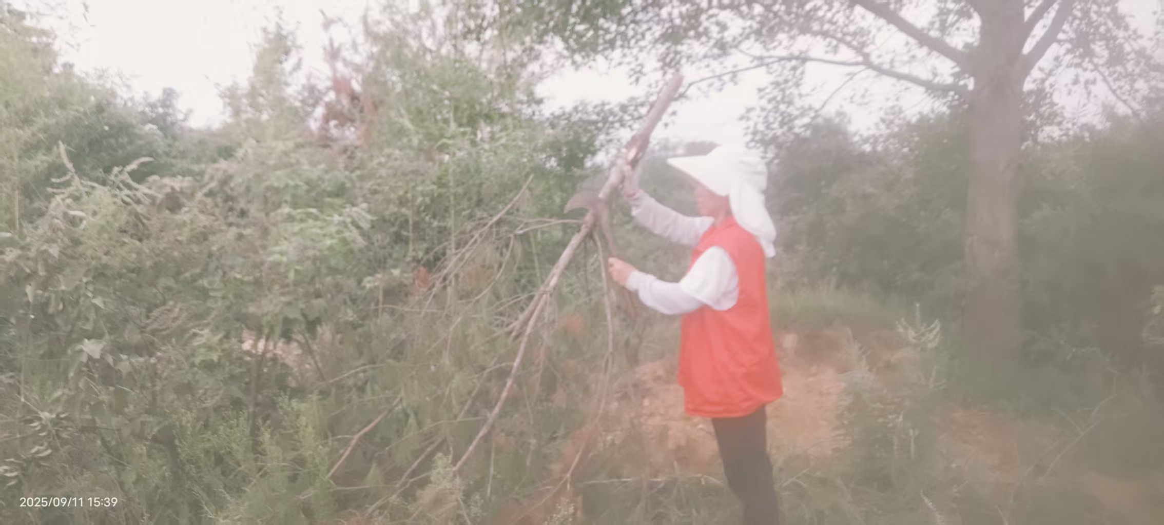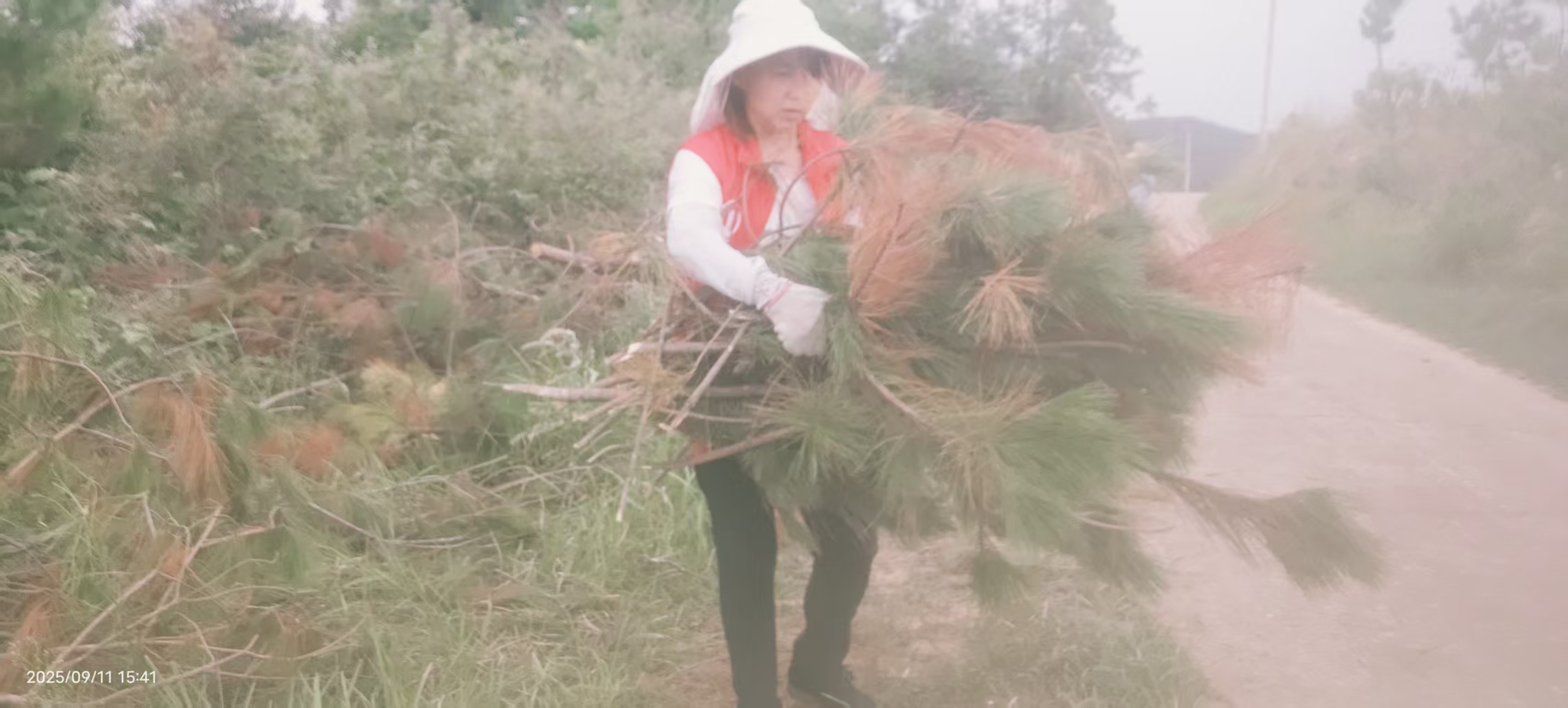 来到山上,要先将枯树枝从草丛中拉至路边,山高路陡杂草丛生,这可不是件容易的事,虽然汗水很快浸湿了衣服,但小程依然干劲十足,努力将众多柴火拉到一堆。为方便老人使用,还细心的将柴火砍至小段,抱到老人家附近堆放。