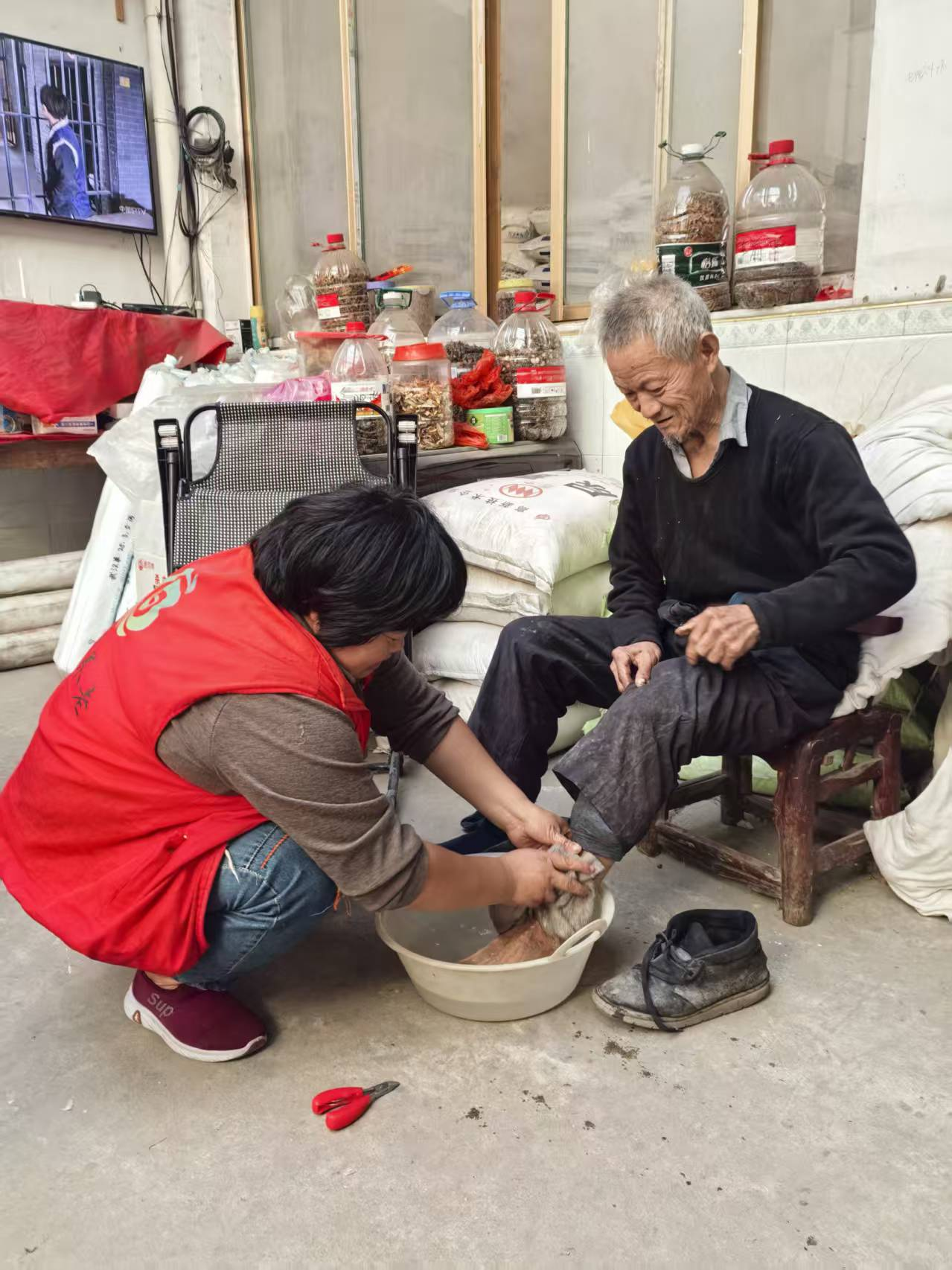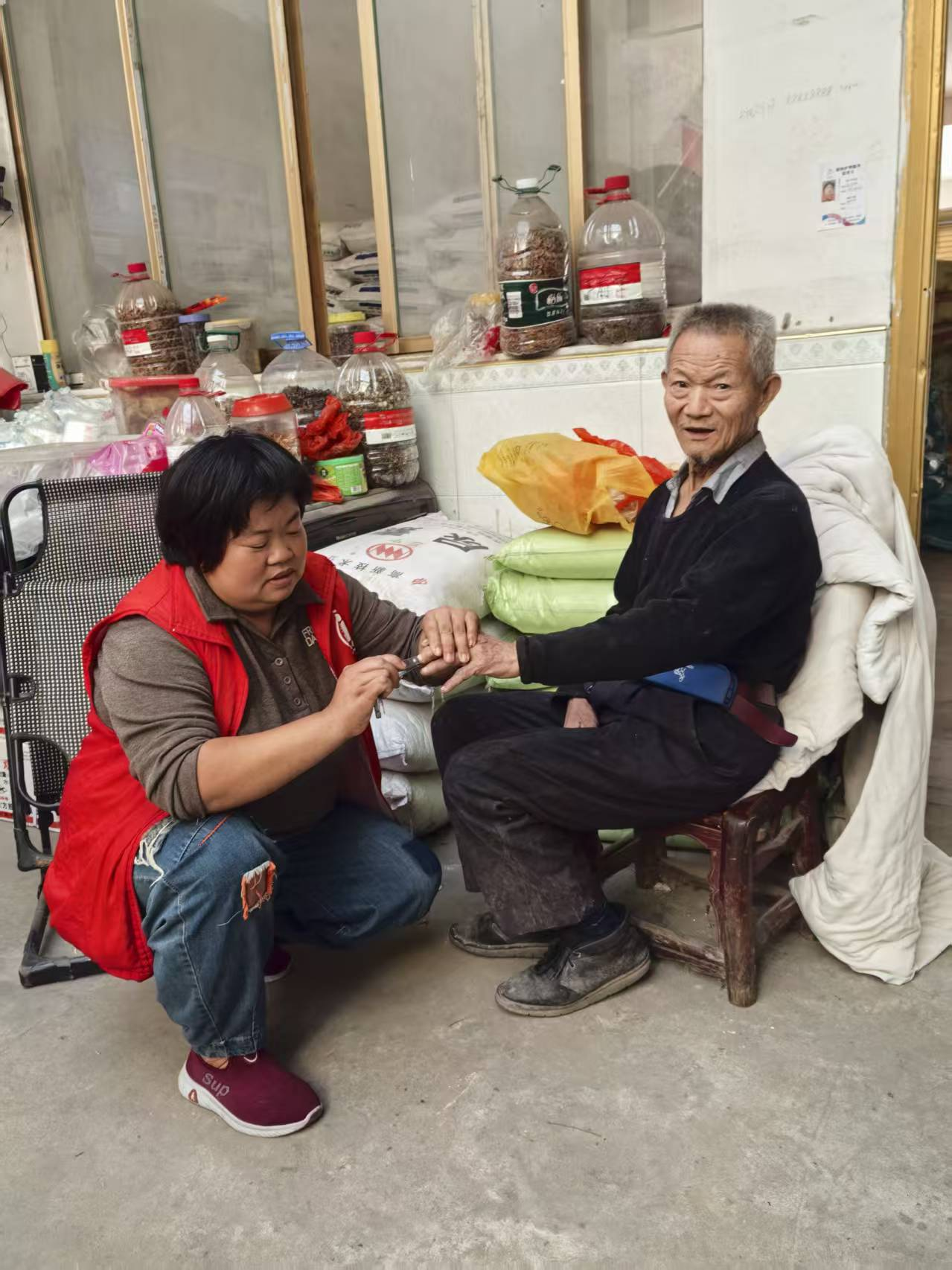 为了解决分散供养特困人员的实际问题,歧亭镇护理员员袁佳银走进特困老人钟冬狗的家里,钟冬狗与弟弟钟再品及弟媳叶和平一起生活,护理员以专业的素养、饱满的热情和无微不至的关怀,照料着老人的日常生活,为老人提供“六助”一护的居家上门服务。她不仅严格遵循护理规范,细致做好饮食照料、起居护理、健康监测等基础工作,更用耐心与爱心关注老人的精神需求——陪老人聊天解闷、倾听老人心声,用温暖的话语驱散老人的孤独,用贴心的举动给予老人家人般的慰藉。