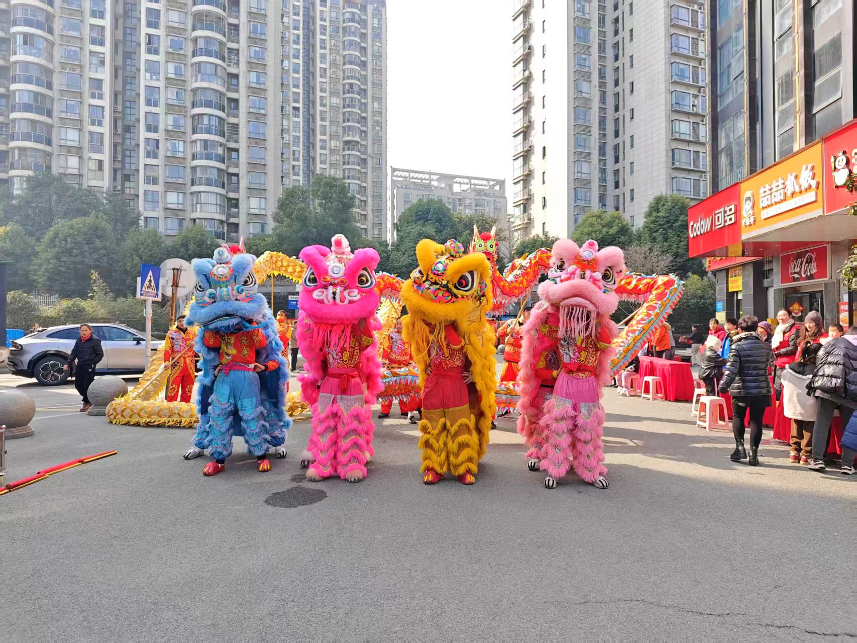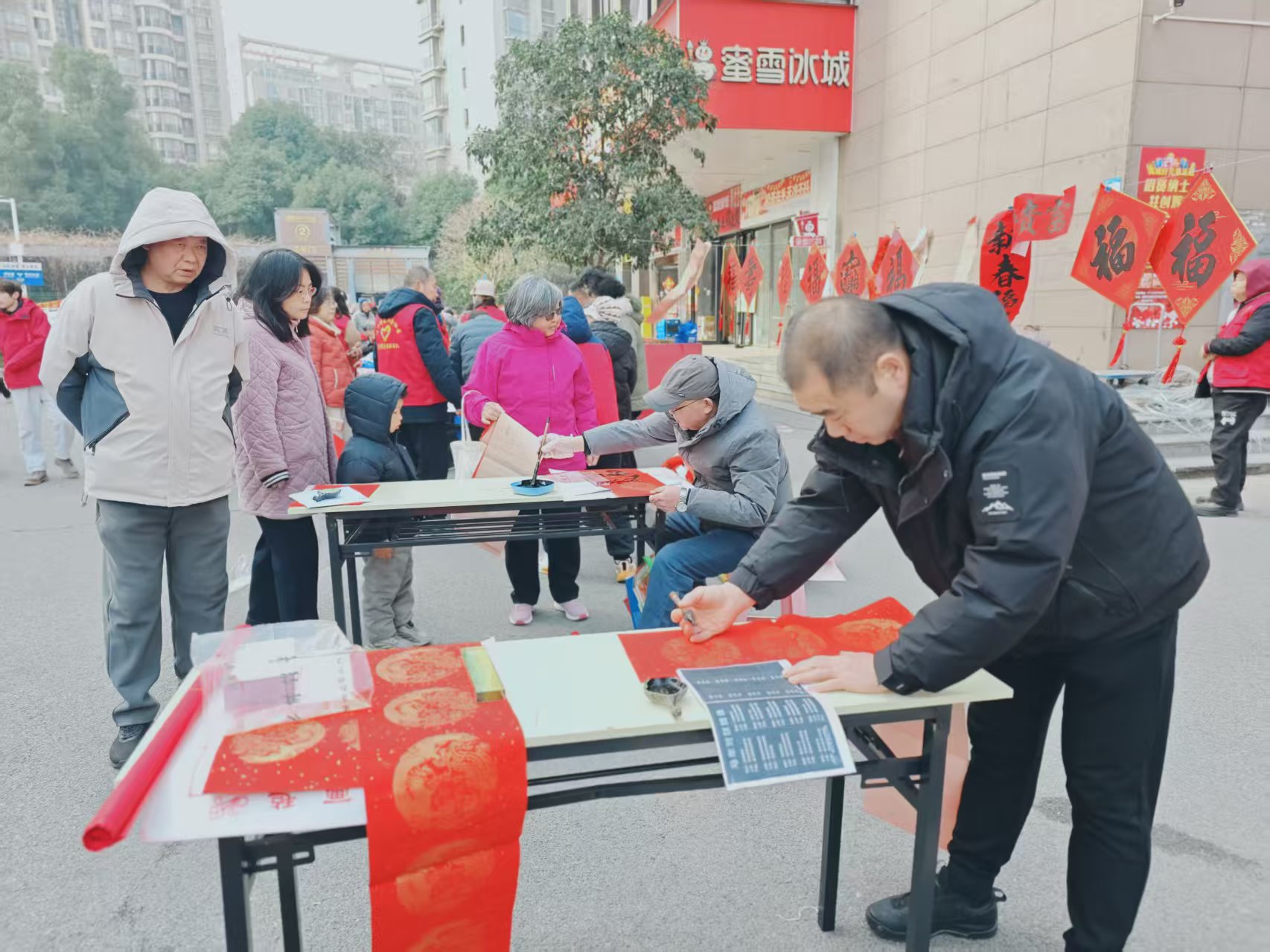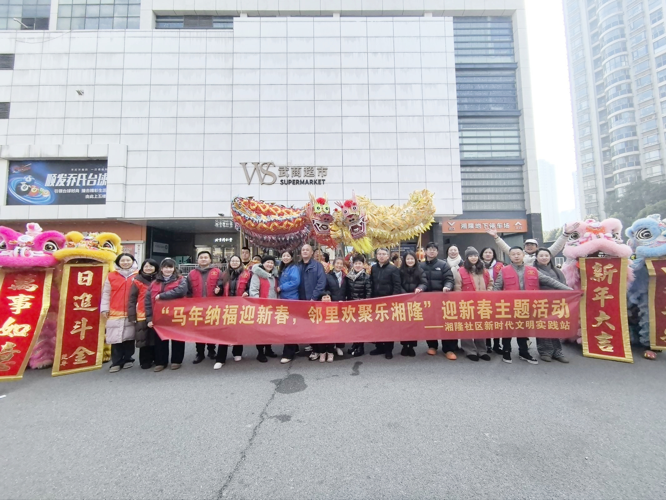 活动当天,武商超市门前广场热闹非凡,“笔墨书香,狮舞贺岁”环节率先点燃现场氛围。专业舞狮队带来的精彩醒狮表演,红绸翻飞、锣鼓喧天,灵动的雄狮时而腾跃、时而摇头摆尾,尽显荆楚大地的新春活力,引得围观居民阵阵喝彩。辖区内的书法爱好者们现场挥毫泼墨,笔走龙蛇间,一副副饱含美好寓意的春联、福字新鲜出炉,免费送到居民手中。拿到春联的老人笑逐颜开,孩子们捧着福字爱不释手,墨香氤氲间,传统年味走进了千家万户。