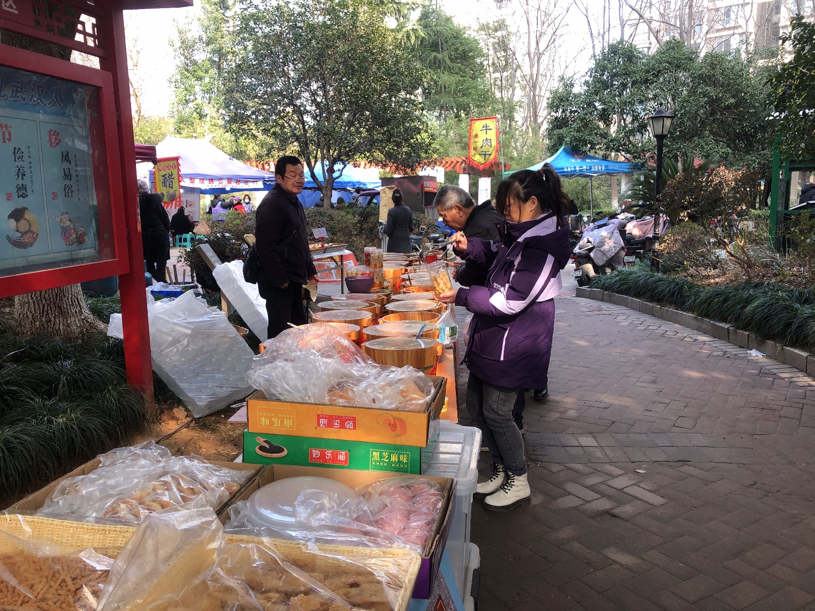 与此同时,湘隆时代大公馆小区4栋旁广场的“年味十足,好物共享”市集也人气爆棚。黄陂炸圆子、洪湖藕粉、恩施手工酱菜等湖北特色年货齐聚一堂,香气四溢;新疆特产、老北京手工糖等各地好物琳琅满目,让人目不暇接。居民们穿梭在各个摊位前,精心挑选心仪的年货,询价声、叫卖声、欢笑声交织在一起,构成了一幅热闹的市井画卷。大家足不出户便一站式备齐了年货,在满满的烟火气中提前感受“舌尖上的团圆”。