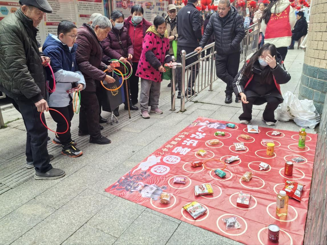 套圈游戏区更是人气高涨,居民们排起长队,瞄准目标、轻轻一掷,套中零食即可带回家,大家玩得不亦乐乎,脸上洋溢着孩子般的笑容。