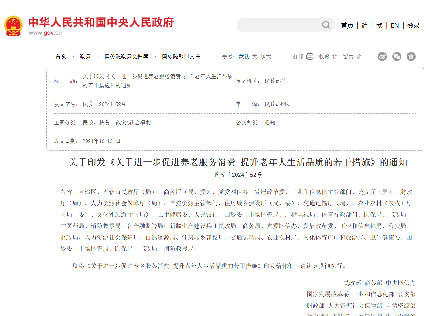 | 标题 | 关于印发《关于进一步促进养老服务消费 提升老年人生活品质的若干措施》的通知 | 发文机关 | 民政部等 |