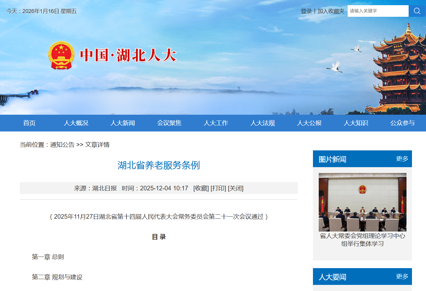 《湖北省养老服务条例》已由湖北省第十四届人民代表大会常务委员会第二十一次会议于2025年11月27日通过,现予公布,自2026年3月1日起施行。