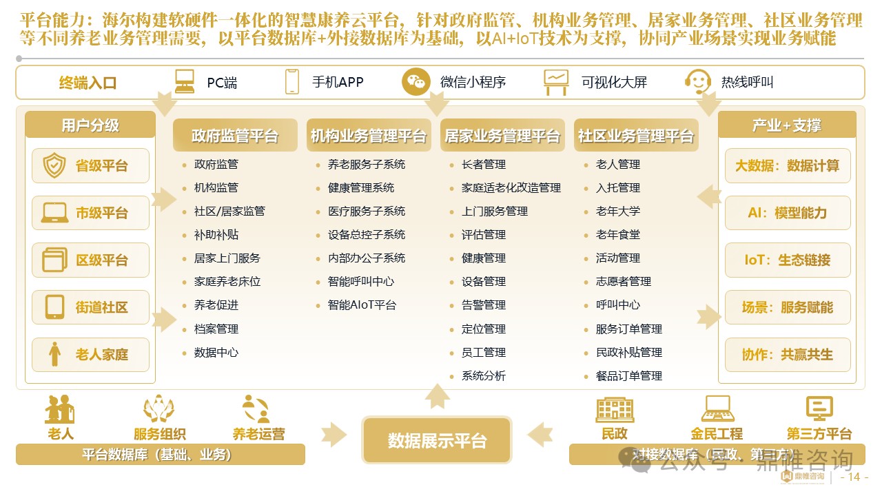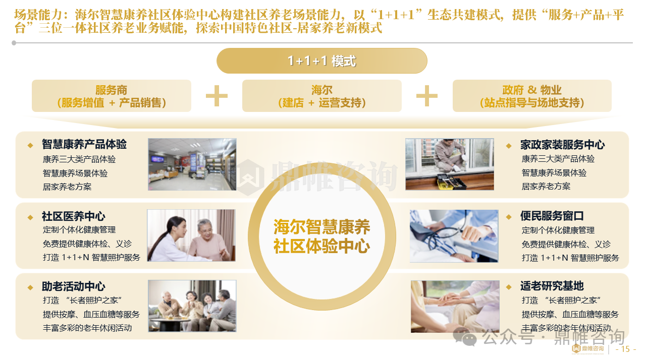 联合政府、物业(提供场地与指导)、服务商(服务增值 + 产品销售),海尔自身负责建店与运营支持,共同打造 “长者照护之家”“社区体验中心” 等触点,实现资源整合与多方共赢。