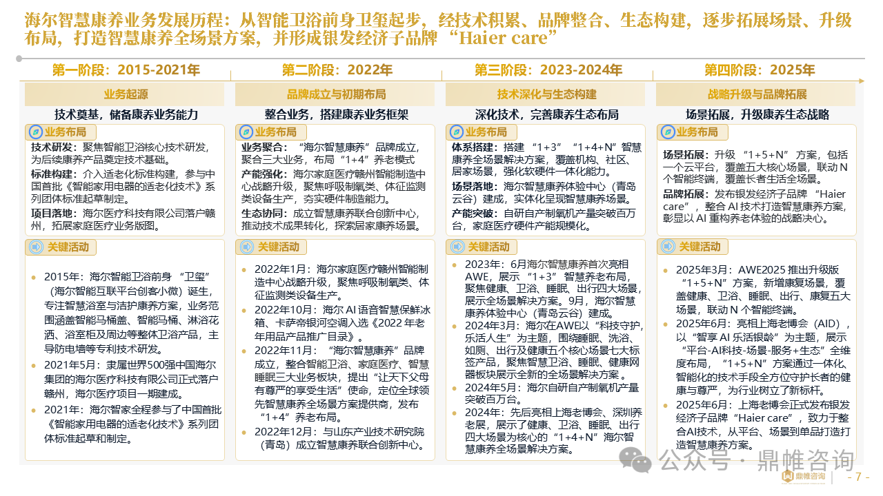 海尔智慧康养的战略发展路径可总结为 “技术筑基 - 业务聚合 - 生态深化 - 场景与品牌升级” 的递进式布局。