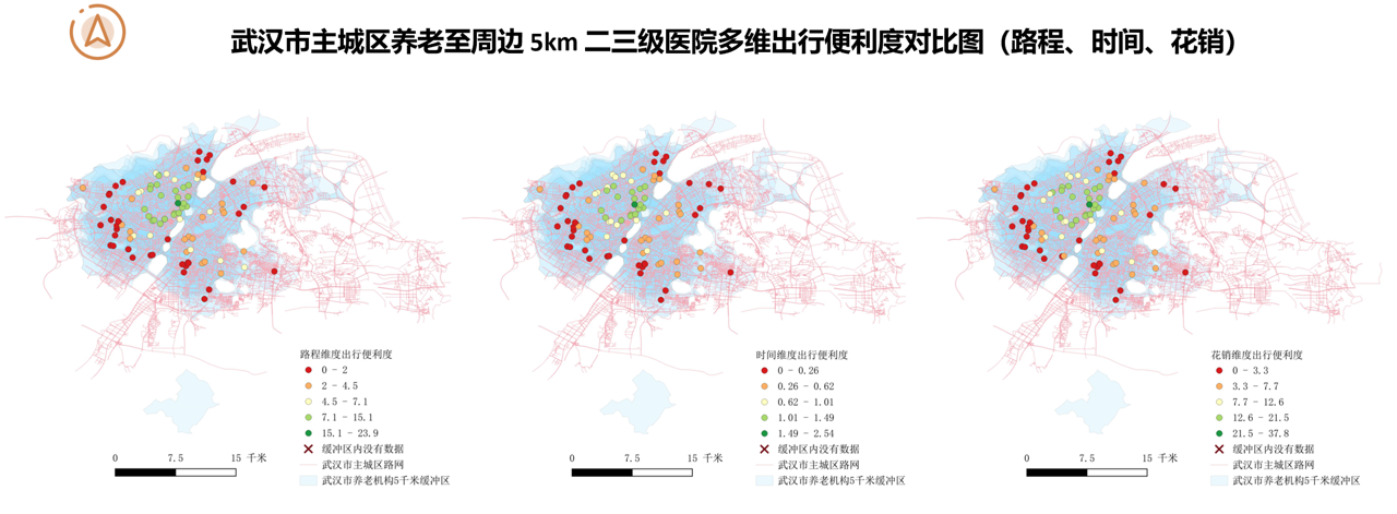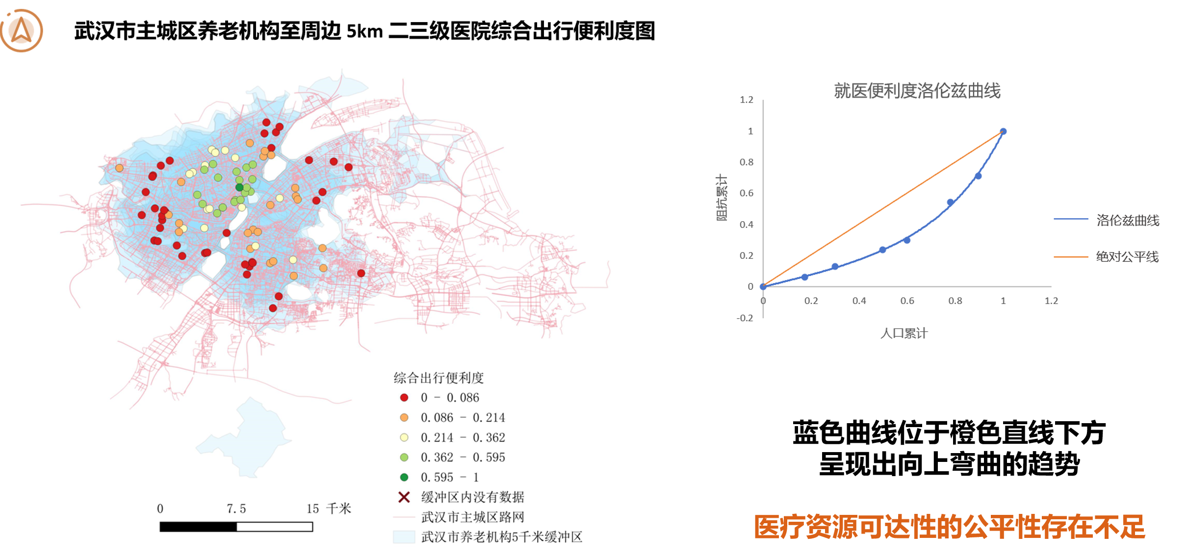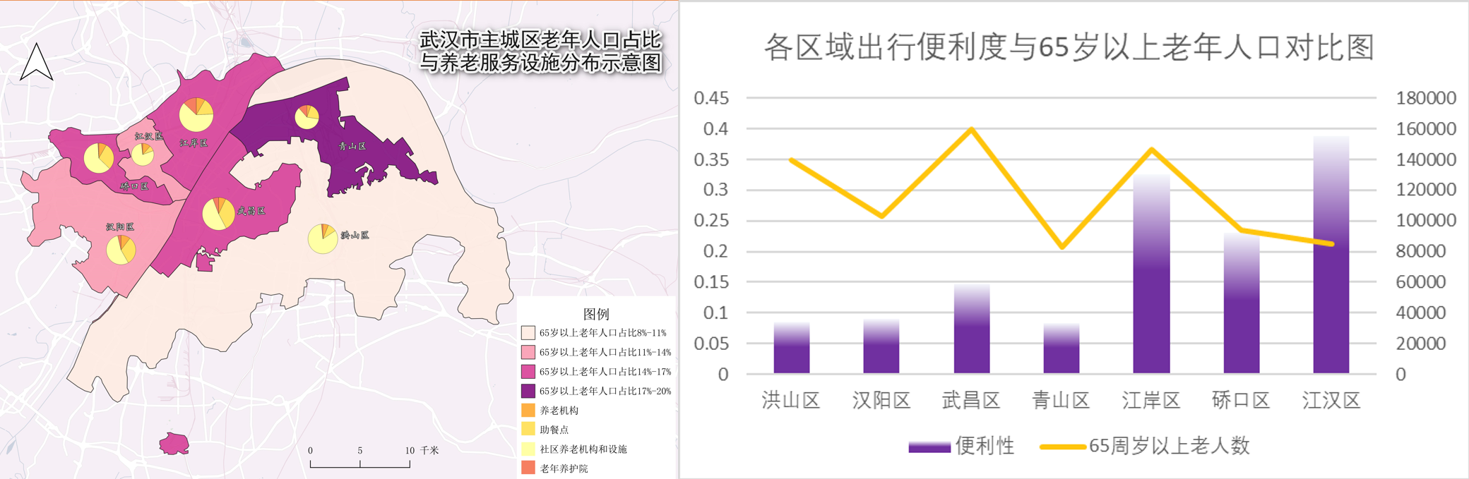 如青山区:第一张图显示老年人口占比高,但第二张图中出行便利度低、老年人口数少 —— 虽整体规模压力小,但局部高龄、失能老人的设施可达性可能不足,需关注 “小众高需求” 群体的服务触达。
