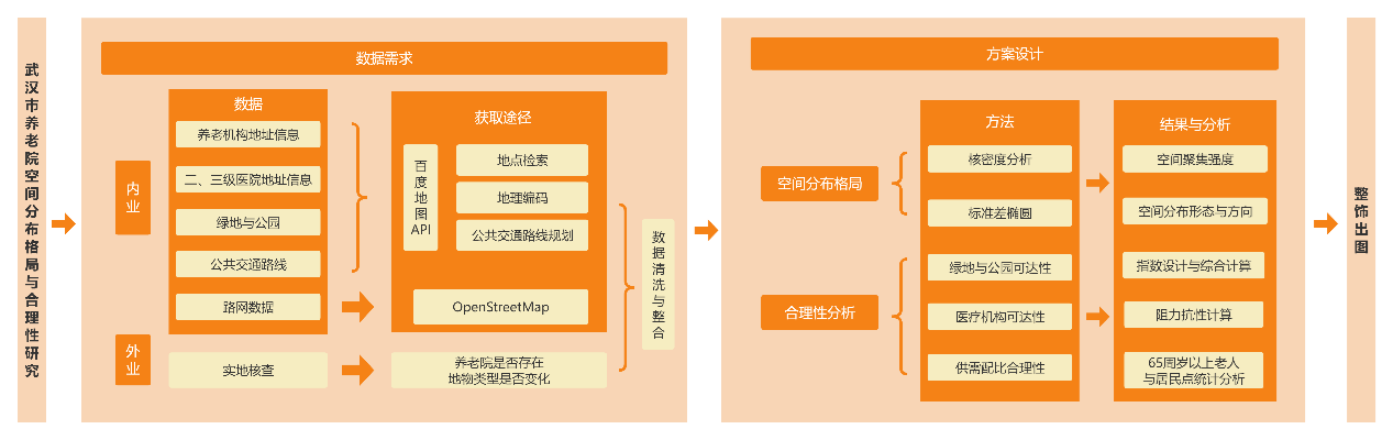 从空间分布格局和合理性两方面分析。空间分布格局用核密度分析看集聚情况,标准差椭圆研究分布方向与范围,还有绿地公园可达性分析;合理性分析涵盖医疗设施可达性、生活配套合理性,同时进行带权设计与综合计算、能力值计算,以及 65 岁以上老人与医院的引力分析,最终输出研究成果图。
