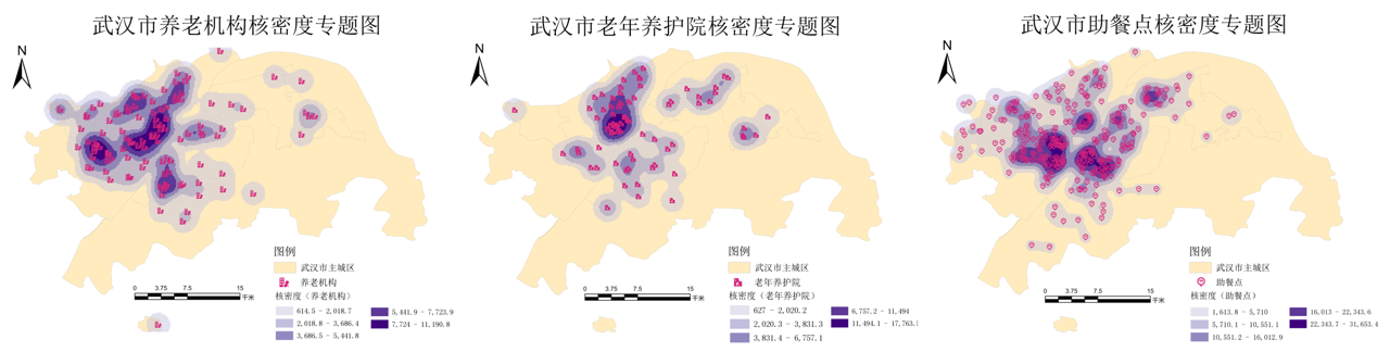 核密度分析:武汉市三类养老设施分布较为一致,核密度结果呈现相似的聚集现象,其中三类设施均较为集中于江岸区。