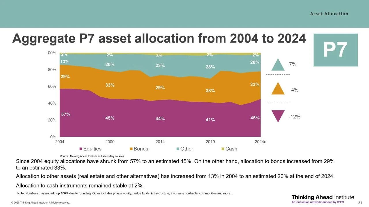 全球养老金资产的配置在过去十年间发生了显著变化。数据显示,自2004年以来,全球养老金资产中股票的配置比例从57%下降至45%,而债券的配置比例则从29%上升至33%。其他资产如房地产、私募股权、对冲基金等的配置比例从13%增加至20%。