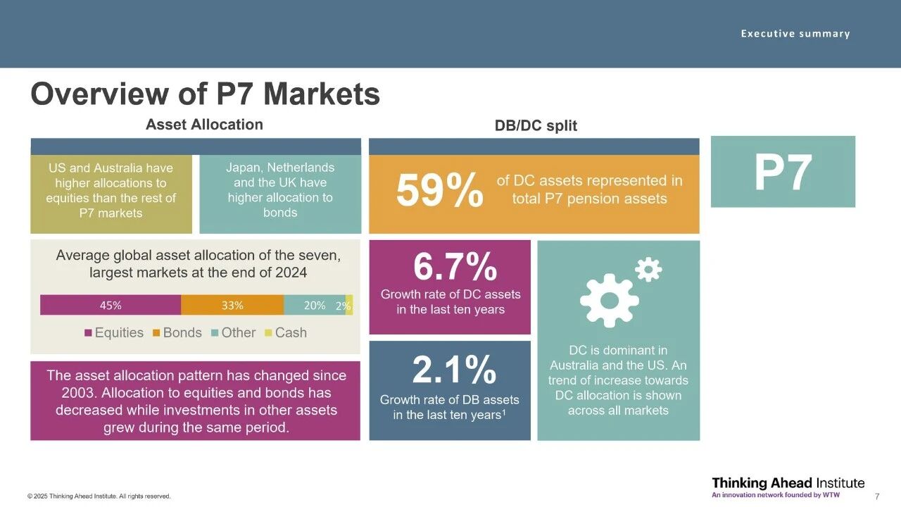 在P7市场中,DC计划的占比在2024年达到了59%,其在全球养老金市场中非常重要。特别是在澳大利亚和美国,DC计划的占比分别达到了89%和69%。
