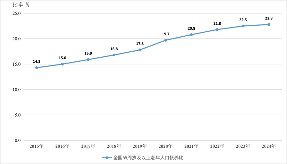 截至2024年末,全国60周岁及以上老年人口31031万人,占总人口的22.0%;全国65周岁及以上老年人口22023万人,占总人口的15.6%。全国65周岁及以上老年人口抚养比22.8%。全国人均预期寿命达79.0岁。